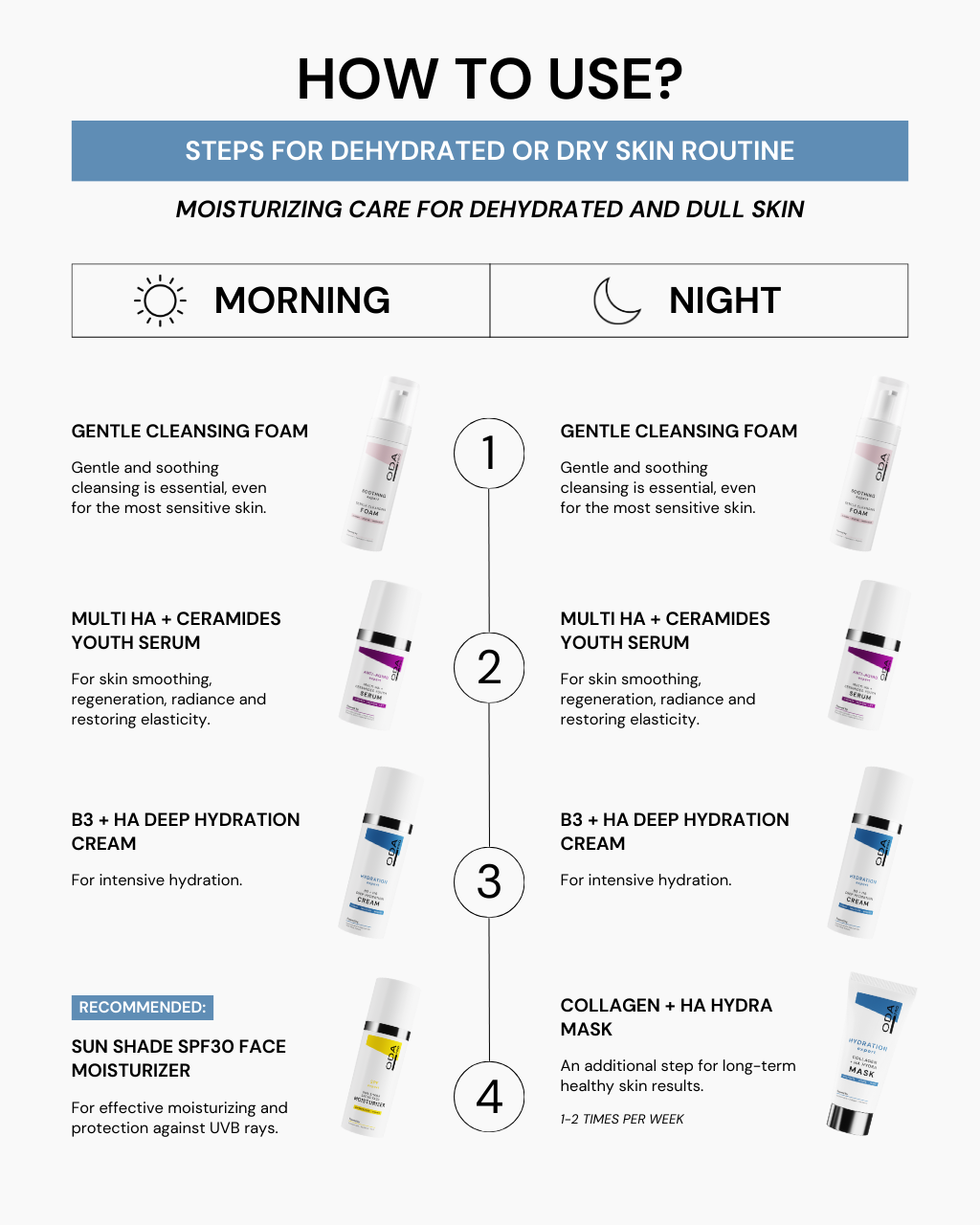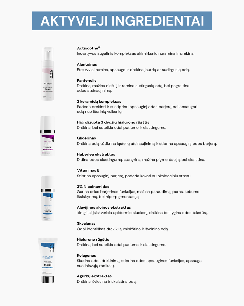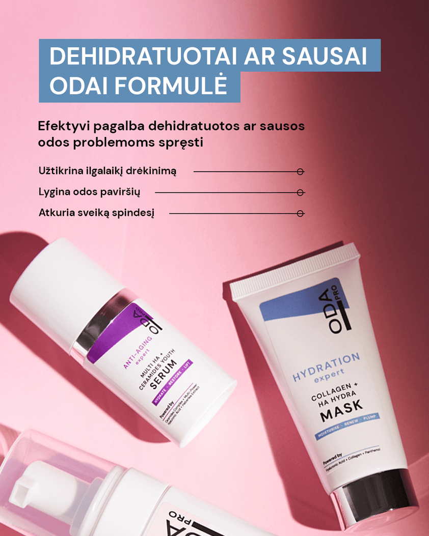 ODA PRO ekspertų sukurta rutina išsausėjusios ar dehidratuotos odos problemoms spręsti, 4 produktai