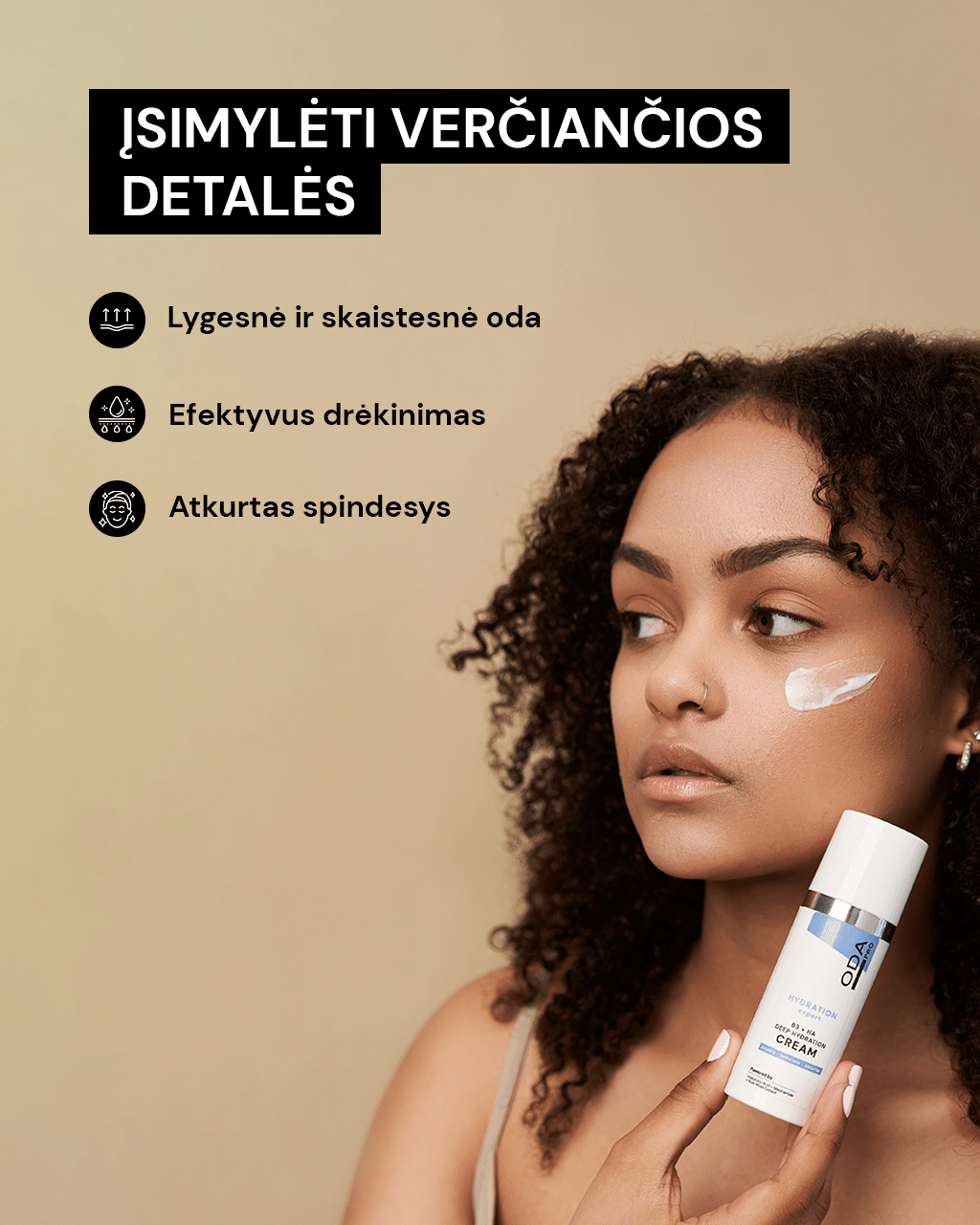 PRIVALUMAI: Akimirksniu drėkina + Atkuria odos struktūrą + Suteikia putlumo