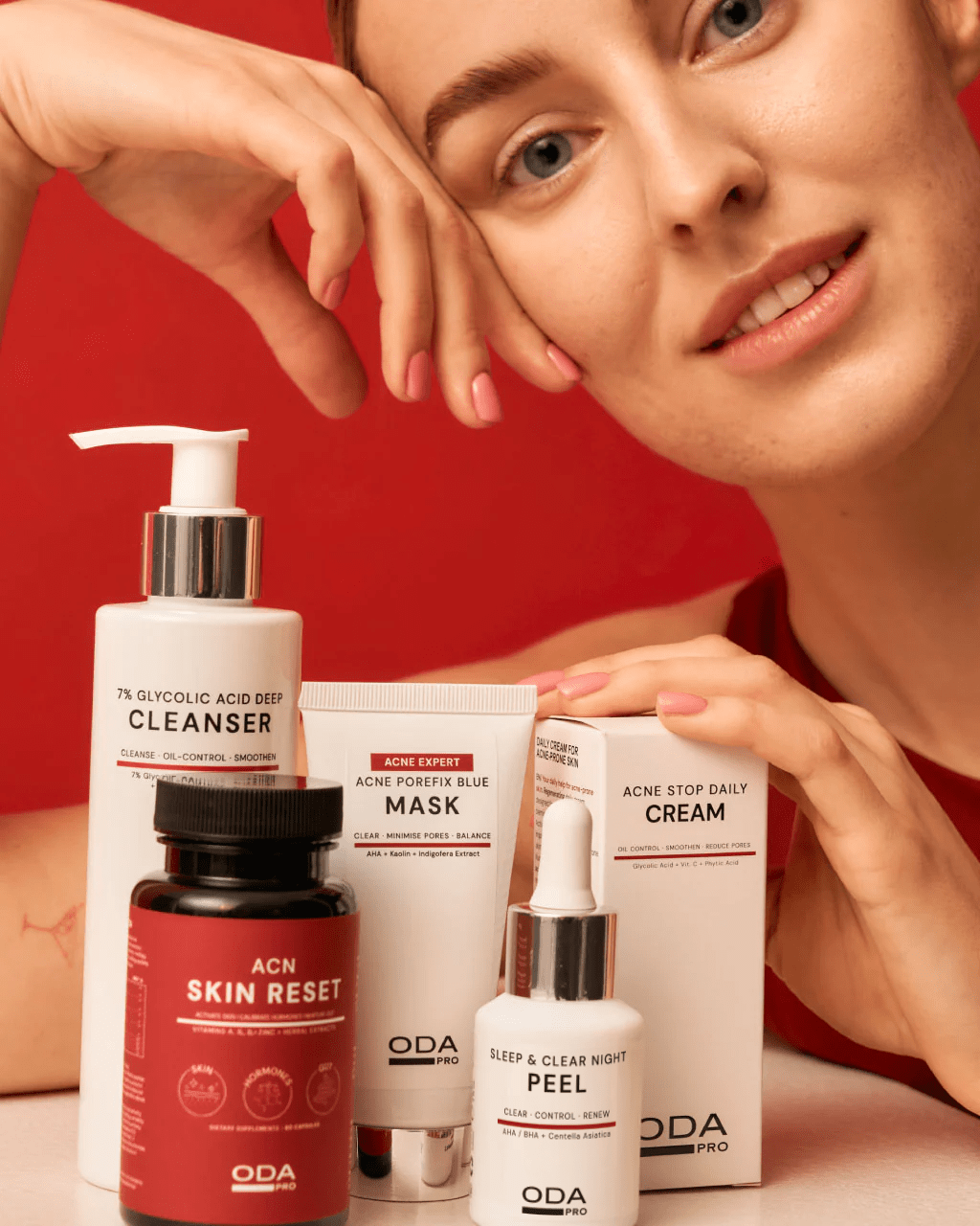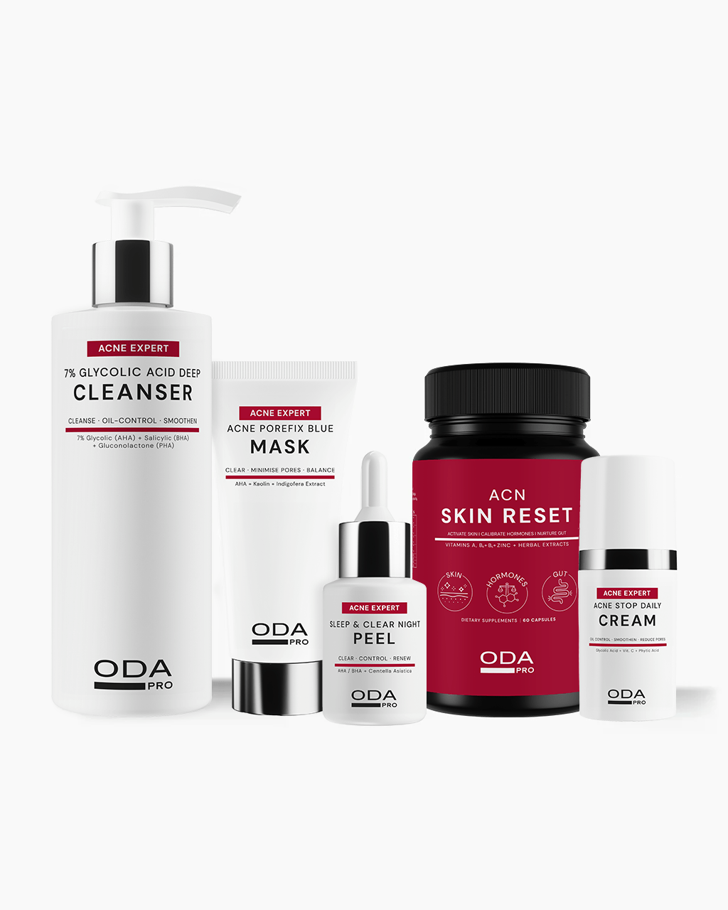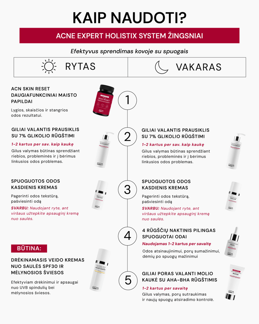 ODA PRO ekspertų sukurtas holistinis sprendimas, skirtas kompleksinei spuoguotos ir problematiškos odos priežiūrai. Pažangių aktyviųjų ingredientų derinys veiksmingai valo, regeneruoja ir subalansuoja odą, o maisto papildai padeda reguliuoti hormonų ir medžiagų apykaitą, užtikrindami ilgalaikius rezultatus, 5 produktai